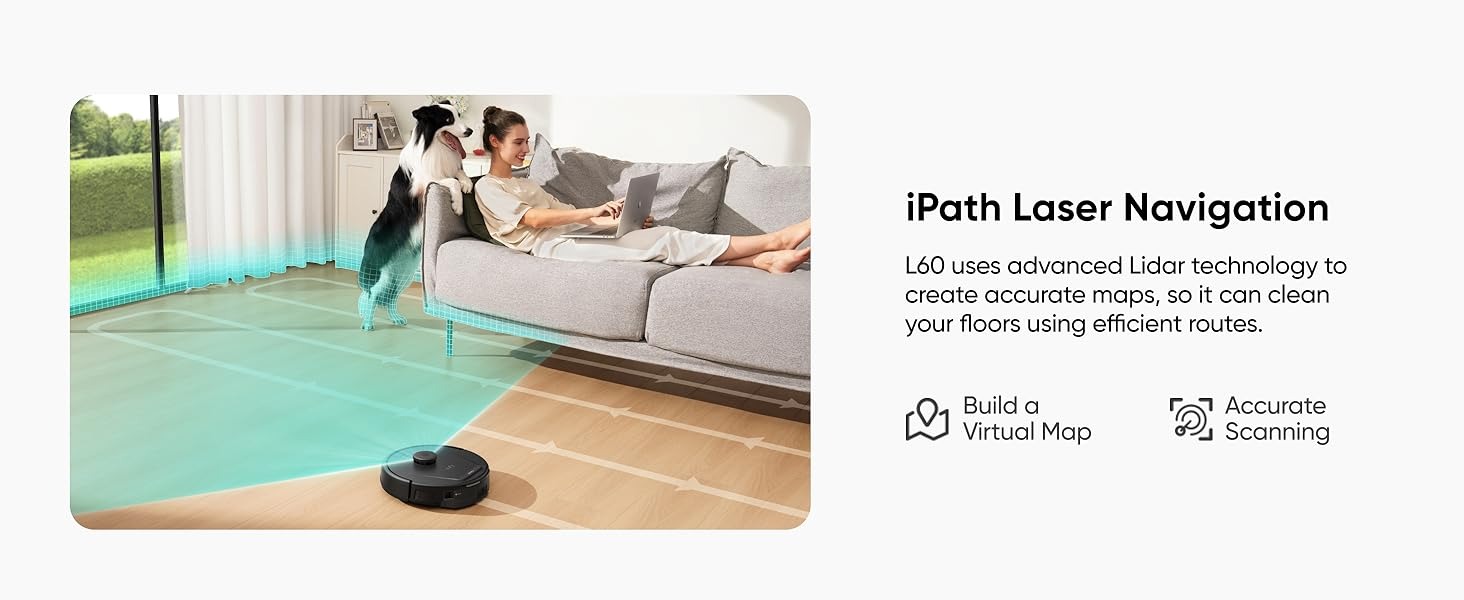 - Precision Mapping for Efficient Navigation: iPath Laser Navigation uses advanced Lidar technology to scan rooms and create accurate maps, resulting in efficient cleaning routes around your home.