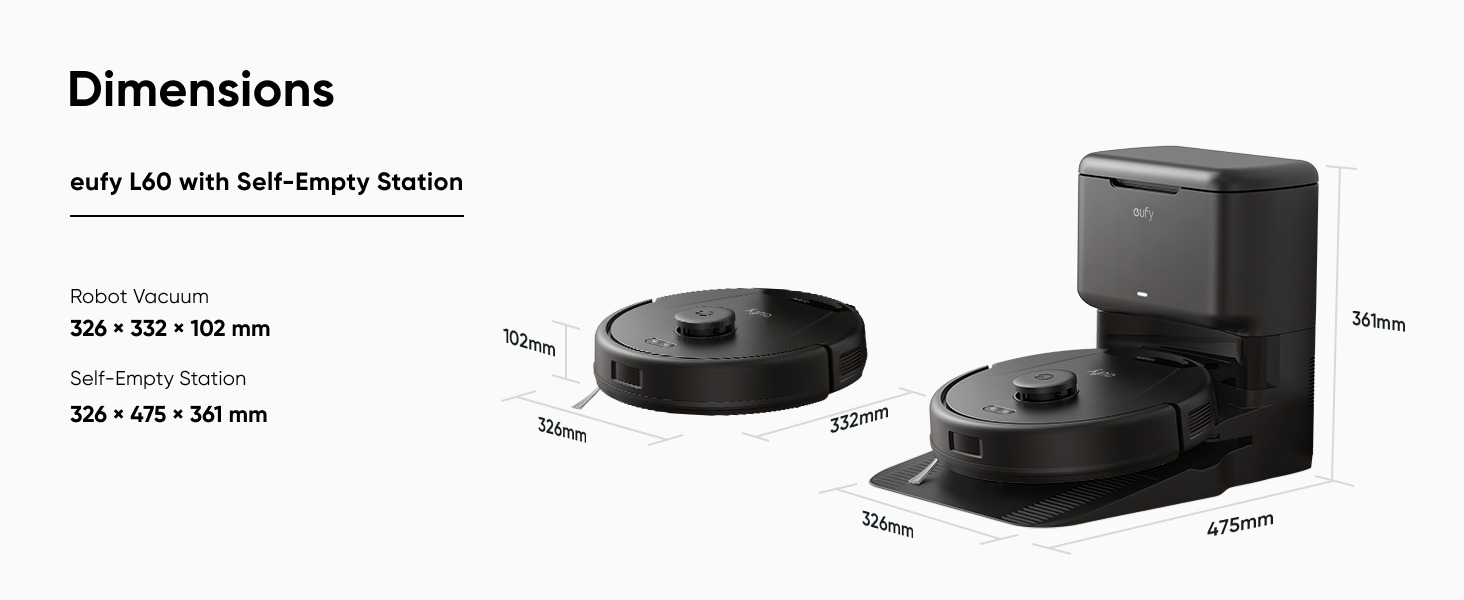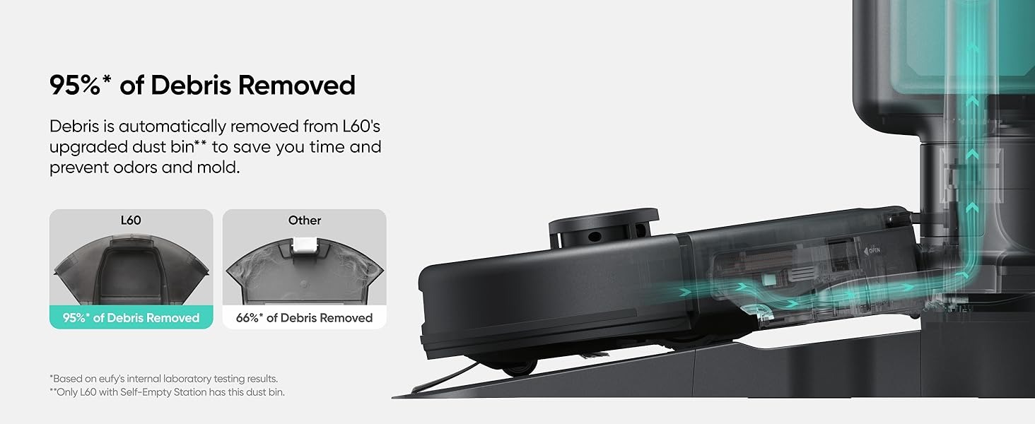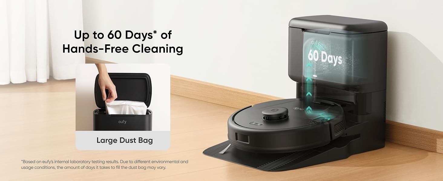 - Up to 60 Days* of Hands-Free Cleaning: 5,000 Pa of suction draws dust and debris out of eufy robot vacuum L60's dust bin and transfers it to a 2.5 L dust bag in the Self-Empty Station. Thanks to the large capacity, you can wait up to 60 days before replacing.