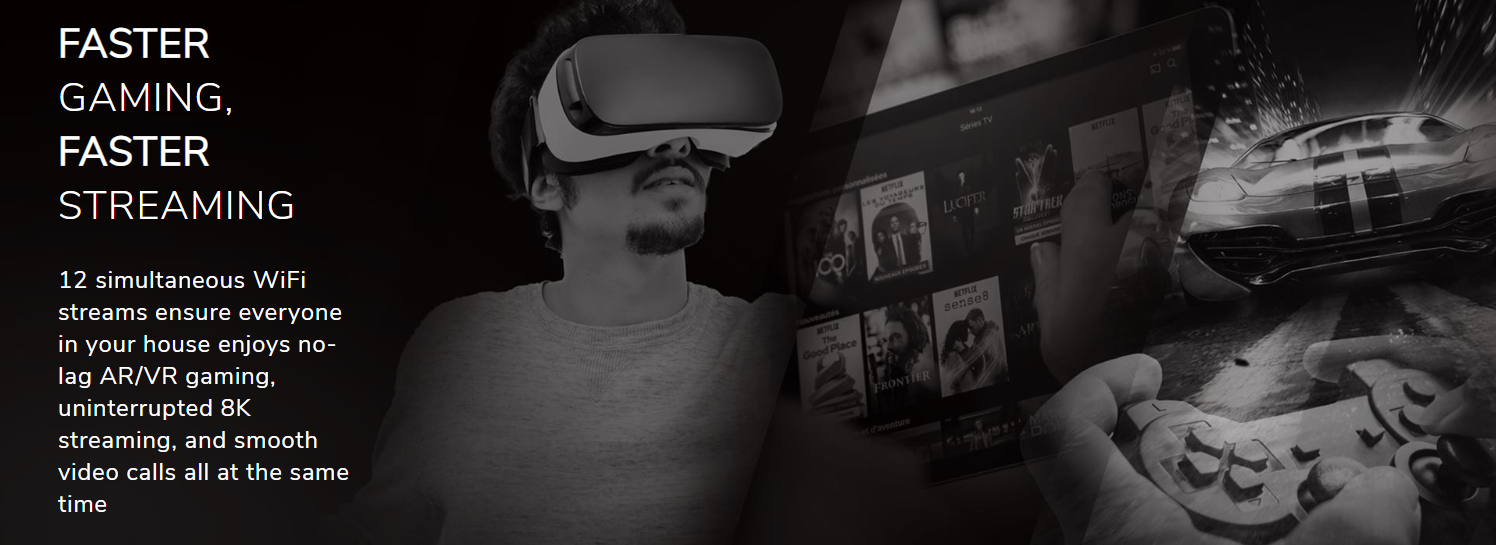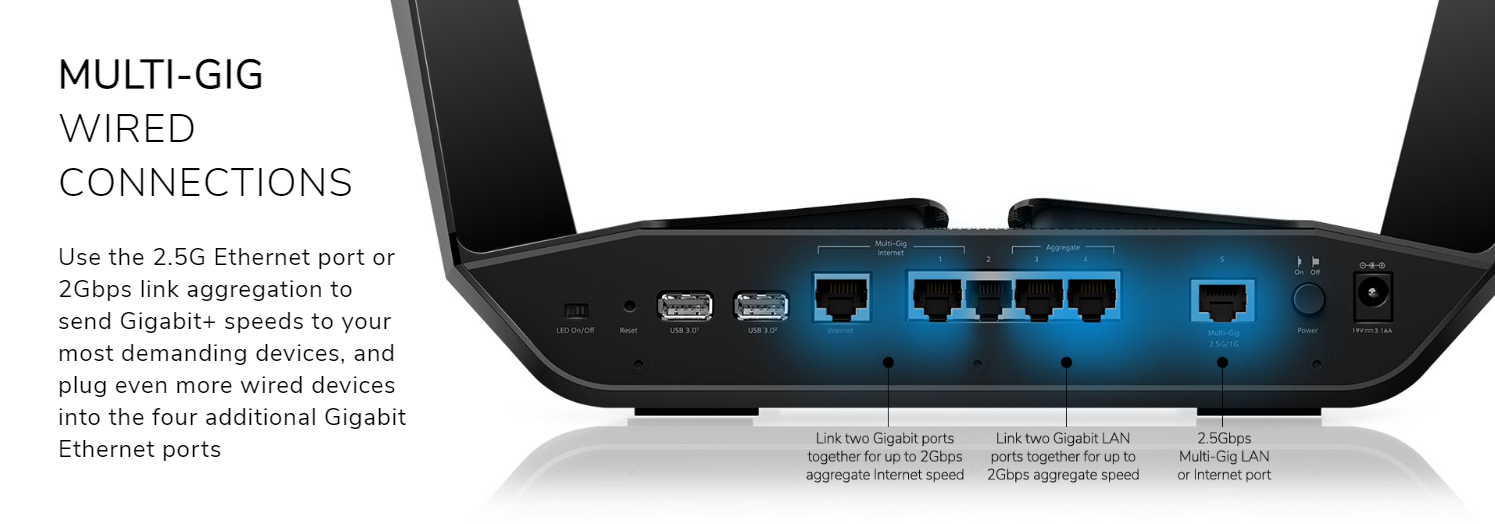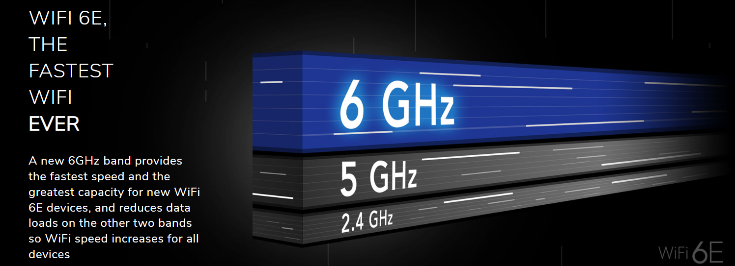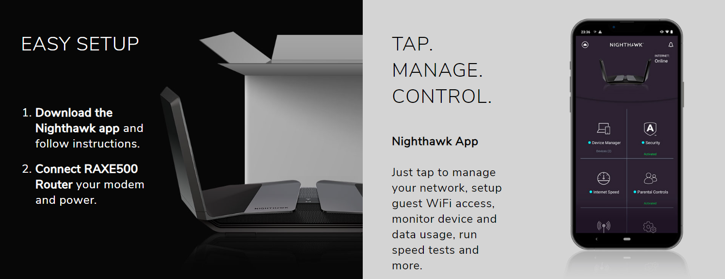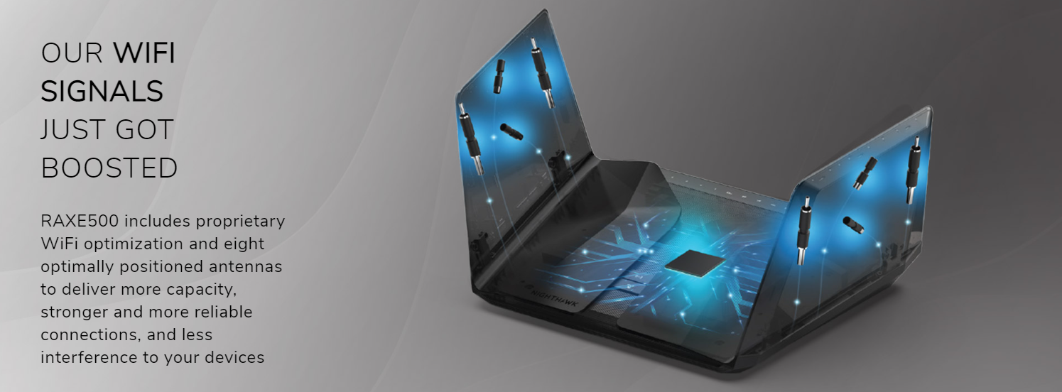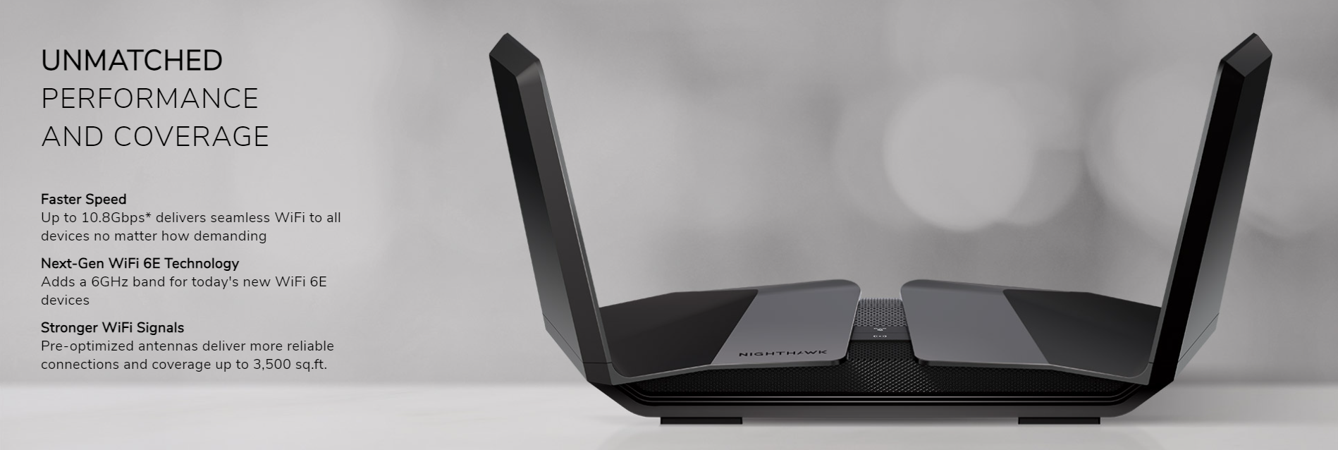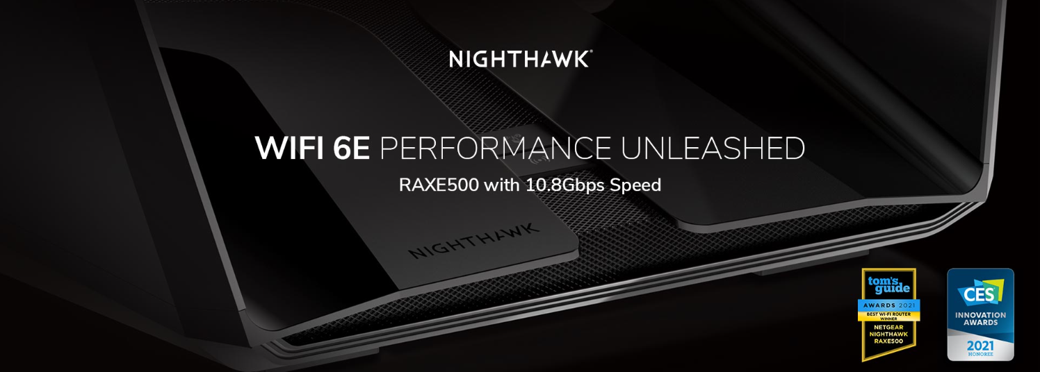 Netgear Nighthawk Tri-Band WiFi 6E Router, (up to 10.8Gbps) with New 6GHz Band, 2.4GHz (1200 Mb/s), 5GHz (4800 Mb/s) & 6GHz (4800 Mb/s), Max 10800 Mb/s Throughput, 8x Internal Antenna, Black | RAXE500